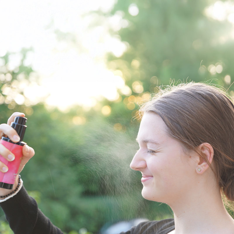 2. Spray 2-3 pumps on your face, hair and around you.